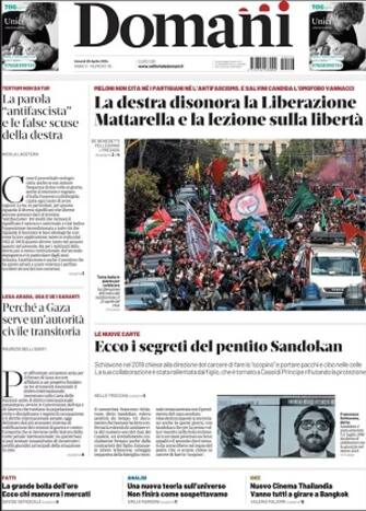 - Titolo principale sempre sul 25 aprile: "La destra disonora la Liberazione. Mattarella e la lezione sulla libertà". In taglio basso, "Ecco i segreti del pentito Sandokan"