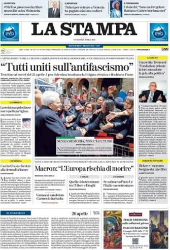 - Apertura sulle parole di Mattarella per il 25 aprile: “Tutti uniti sull’antifascismo”. In spalla, il caso Crt: "Guzzetti a Tremonti: 'Fondazioni private, la loro cassaforte fa gola alla politica'". In taglio medio, le parole del presidente della Francia: "Macron: 'L'Europa rischia di morire'"