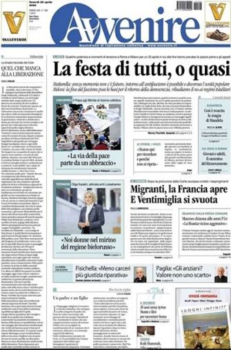 - Apertura sul 25 aprile: "La festa di tutti, o quasi". Editoriale di Danilo Paolini: "Quel che manca alla Liberazione". Fotonotizie sul Papa che ha incontrato l'Azione cattolica ("La via della pace parte da un abbraccio") e su Olga Karakh, attivista anti Lukashenko: "Noi donne nel mirino del regime bielorusso". Taglio medio, "Migranti, la Francia apre e Ventimiglia si svuota"