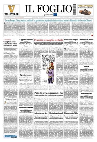- Apertura con titolo "Lavoro, Europa, Difesa, candidati. Lo spettacolo dei populismi italiani travolti dai numeri e dalla realtà (lo dice anche Macron)". Tra gli altri tagli alti il titolo sull'ultimatum di Israele: "Chia agita il movimento contro l'accordo con Hamas". E un pezzo titolato "L'Ucraina, la Georgia e la libertà". Spazio anche a Putin che ha perso la guerra del gas