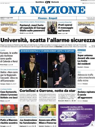 - Apertura con titolo "Università, scatta l'allarme sicurezza". Dilaga la protesta pro Palestina dagli Usa alla Francia. A Milano annullato convegno su Israele alla Statale: rischi per l'incolumità. Spazio in taglio centrale ai David di Donatello: sei premi a C'è ancora domani e sette a Io capitano. Cortellesi e Garrone, notte da star