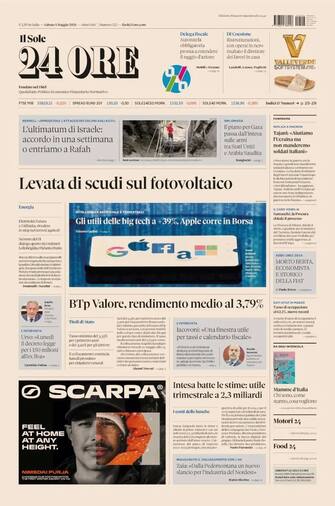 - Apertura con titolo "Levata di scudi sul fotovoltaico". Spazio anche agli utili delle big tech a +39%, Apple corre in Borsa. E in pagina si parla anche di Btp Valore, con il rendimento medio al 3,79%. In taglio alto l'ultimatum di Israele ad Hamas per stringere i tempi sull'accordo