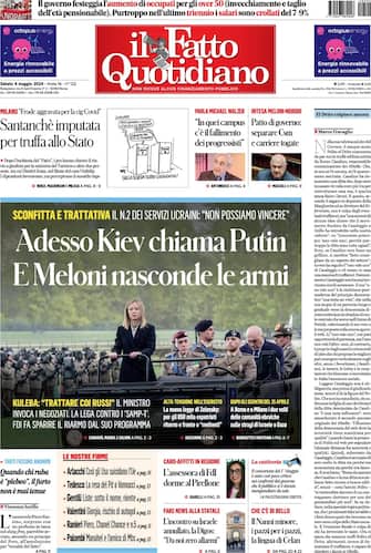 - Apertura con titolo "Adesso Kiev chiama Putin. E Meloni nasconde le armi". Il numero 2 dei servizi ucraini: "Non possiamo vincere". Kuleba invoca i negoziati: "Trattare coi russi". Spazio in pagina anche al patto di governo per separare Csm e carriere toghe. E si parla anche di Santanchè imputata per truffa allo Stato