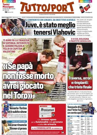 - Apertura con titolo "Se papà non fosse morto avrei giocato nel Toro". Intervista a Sandro Mazzola, figlio di capitan Valentino, a 75 anni dalla tragedia di Superga. Spazio anche alla Juve: è stato meglio tenersi Vlahovic nel confronto con Lukaku. In pagina anche il pari del Torino di ieri: traversa, errori e rimpianti, che triste finale