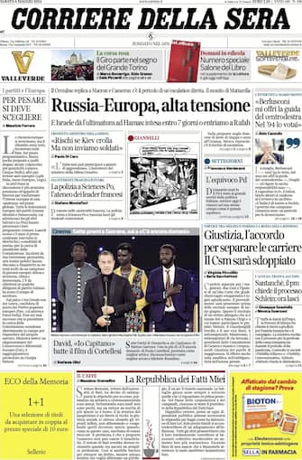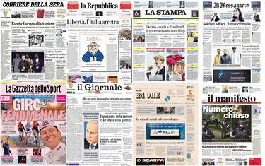 Diversi i temi affrontati dalle aperture dei giornali. In primis la guerra in Ucraina con il rischio di una escalation. Spazio anche all’ultimatum di Israele ad Hamas: o si trova un'intesa entro 7 giorni o ci sarà l’ingresso a Rafah. In molte prime pagine anche il report sulla libertà di stampa, con il nostro Paese che perde posizioni. Poi i David di Donatello, con il trionfo di Garrone e Cortellesi, e l’inizio del Giro d’Italia di ciclismo