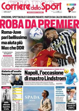 - "Juve: Fede e speranza". E' Chiesa, insieme a Bremer che sigla il gol del pari, uno dei protagonisti bianconeri nella super sfida contro Lukaku (anche lui a segno) e compagni all'Olimpico. Per il tennis parla Sinner che, dopo il recente infortunio, dice: "Anche Parigi a rischio". Spazio poi, ancora, a Pogacar che trionfa al Giro d'Italia e alla morte del "Flaco" Menotti in Argentina