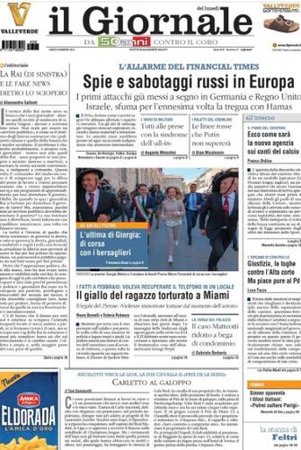 - In apertura l'allarme del Financial Times: "Spie e sabotaggi russi in Europa". Conflitto in Medioriente, "sfuma per l'ennesima volta la tregua" tra Israele ed Hamas. Fotostoria dedicata a Giorgia Meloni "di corsa con i bersaglieri", in taglio più basso il giallo dello studente italiano "torturato a Miami". Per lo sport, parla Sinner: "Potrei saltare Parigi"