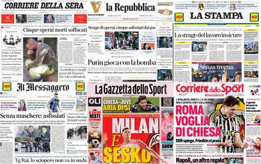 La strage di Casteldaccia, con la morte dei cinque operai asfissiati in una rete fognaria del Palermitano, costituisce il titolo principale di quasi tutti i giornali. Appelli alla sicurezza sul lavoro e denuncia delle irregolarità tornano a far capolino sulle prime pagine, dove c'è spazio anche per le minacce nucleari di Vladimir Putin e, soprattutto, per le difficoltà nel raggiungimento di una tregua tra Israele e Hamas. Sugli sportivi domina il calciomercato, con i nomi di Sesko e Chiesa tra i più caldi