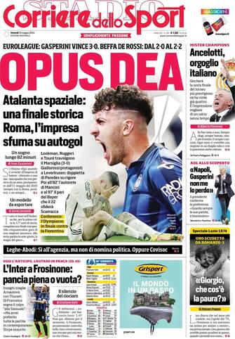 - Il giornale sportivo apre con il risultato ottenuto ieri sera dall’Atalanta che, dopo aver battuto il Marsiglia 3-0, vola in finale di Europa League. Impresa sfiorata invece per la Roma che pareggia 2-2 con il Bayer Leverkusen e manca l'accesso alla finale del torneo