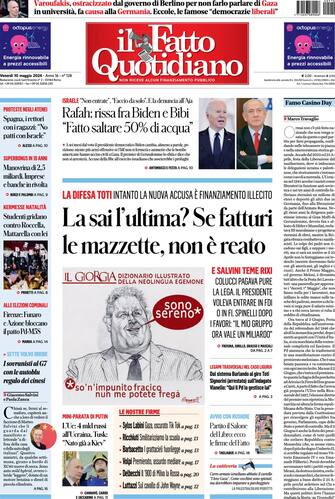 - “La sai l’ultima? "Se fatturi le mazzette non è reato”: titolo di apertura ironico per il giornale che torna sull’inchiesta contro il governatore della Liguria Giovanni Toti, accusato di finanziamenti illeciti. Spazio anche alla guerra in Medioriente, dopo la minaccia del presidente Usa Biden di non inviare più armi offensive a Israele qualora dovesse invadere Rafah. “Non entrate”, “Faccio da solo”. Rissa tra Biden e Bibi