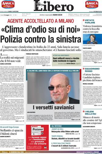 - Il quotidiano apre con quanto accaduto alla stazione di Milano Lambrate. “«Clima d’odio su di noi». Polizia contro la sinistra”. “I versetti savianici”: il riferimento è alla polemica tra Roberto Saviano e Giorgia Meloni, ripresa ieri dallo scrittore Rushdie che al Salone del libro di Torino ha preso le parti dell’amico autore