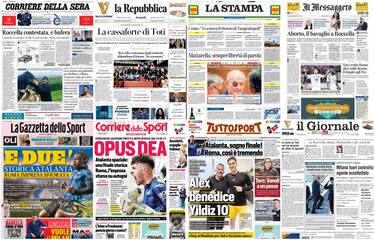 Le aperture dei quotidiani di oggi spaziano dall'inchiesta sul caso Liguria che ha coinvolge anche il governatore della Regione Toti, al caso di contestazione contro la ministra Roccella avvenuto ieri agli Stati generali della Natalità. Spazio anche al calcio con l'Atalanta che ha conquistato la finale di Europa League, si ferma invece la corsa della Roma