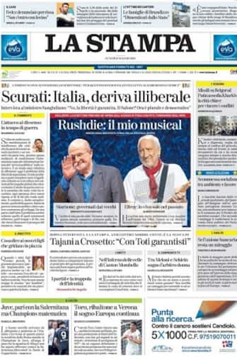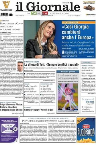 - Titolo principale sull'intervista alla sorella della premier Arianna Meloni: "Così Giorgia cambierà anche l'Europa". In spalla, editoriale dell'ex premier spagnolo Aznar: "Dopo guerra e Covid ora è tempo di tornare liberali". Taglio centrale dedicato all'inchiesta in Liguria: "La difesa di Toti: 'Sempre bonifici tracciati'". Fotonotizia sulla kermesse sonora in Svezia: "Il conformismo triste dell'Eurovision fluido". In spalla, taglio basso, il punto sulla guerra in Ucraina