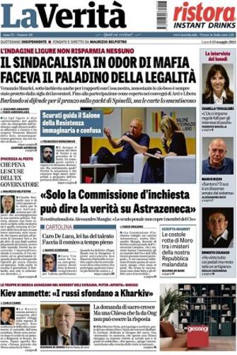 - Titolo principale sull'indagine per corruzione in Liguria: "Il sindacalista in odor di mafia faceva il paladino della legalità". Fotonotizia sulla kermesse libraria di Torino: "Scurati guida il Salone della Resistenza immaginaria e confusa". In taglio centrale, intervista al costituzionalista Mangia sui vaccini: "Solo la commissione d'inchiesta può dire la verità su Astrazeneca". In taglio basso, la guerra in Ucraina: "Kiev ammette: 'I russi sfondano a Kharkiv'"