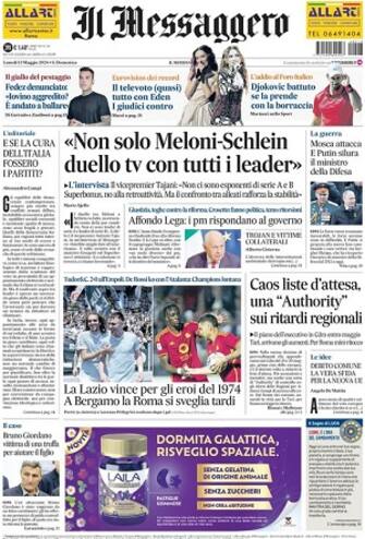 - Titolo principale sull'intervista al vicepremier e leader di Forza Italia Tajani riguardo i prossimo confronto televiso tra presidente del Consiglio e leader Pd: "Non solo Meloni-Schlein: duello tv con tutti i leader". In taglio alto, tre box: la denuncia Fedez per essere stato presente durante l'aggressione a Iovino, il punto sull'Eurovision e la performance deludente di Djokovic al Foro italico. In taglio medio, il Carroccio sulla giustizia: "Affondo Lega: i pm rispondano al governo". In spalla, il conflitto in Ucraina. Fotonotizia sulla Serie A