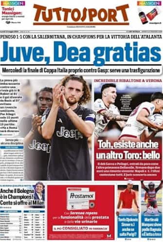 - Altro titolo di apertura dedicato ai bianconeri: "Juve, Dea gratias". Box centrale sul Torino: "Toh, esiste anche un altro Toro: bello". In taglio basso, "Anche il Bologna è in Champions. Conte si offre al Milan". Poi approfondimenti sul tennis e sul Motomondiale