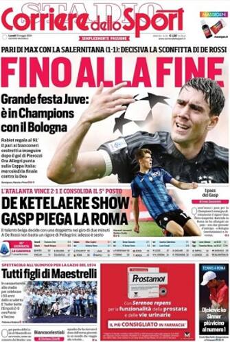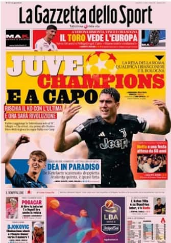 - Titolo principale sulla Vecchia signora: "Juve, Champions e a capo". Taglio medio su Atalanta ("Dea in paradiso") e Bologna ("Motta e una festa attesa da 60 anni"). In spalla, taglio basso, il punto sul Giro d'Italia e sul torneo di tennis del Foro Italico