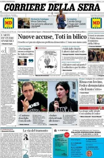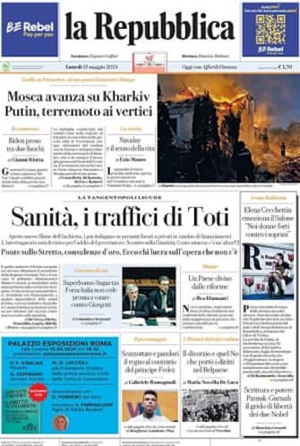 - Il titolo principale è sull'inchiesta per corruzione che ha travolto la Regione Liguria: "Nuove accuse, Toti in bilico". In spalla, il punto sull'offensiva di Mosca in Ucraina: "I russi avanzano. E Putin rimuove il ministro della Difesa". Fotonotizia centrale sulle interviste a Elio ("L'autismo di mio figlio. E noi da soli") e Giulia Cecchettin ("Isolare chi fa male alle donne"). In spalla, "Rissa con Iovino, Fedez denunciato: 'Io non c'ero'"