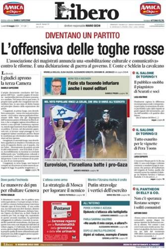 - Apertura sulle tensioni tra governo e magistratura sulle riforme nel campo della giustizia: "L'offensiva delle toghe rosse". In taglio centrale, un approfondimento su Discovery: "Fazio sta facendo infuriare anche i nuovi editori". Segue la fotonotizia sull'Eurovision: "L'israeliana batte i pro-Gaza". In spalla, tre approfondimenti sul Salone del libro di Torino. In taglio basso, focus sull'avanzata russa in Ucraina
