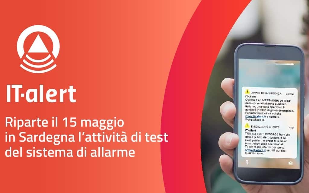 Un nuovo test di IT Alert è previsto nella mattinata di mercoledì 15 maggio (alle ore 11 per la precisione) in Sardegna. IT-alert è il sistema di allarme pubblico di cui si sta dotando l’Italia che, quando sarà operativo, permetterà di diffondere allarmi pubblici che arriveranno sui dispositivi mobili di coloro che si troveranno in un’area interessata da gravi emergenze o catastrofi imminenti o in corso.