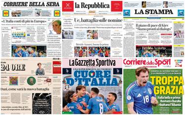 - "Ue, battaglia sulle nomine" è il titolo d'apertura. "I 27 leader si vedono domani. No dei socialisti all'alleanza con Meloni: è di estrema destra. Crepe nel Ppe su Ursula. La premier chiude il G7: l'Europa riconosca il peso dell'Italia. E sulle risse in Parlamento: provocati dall'opposizione". Al centro, la vittoria della Nazionale con l'Albania