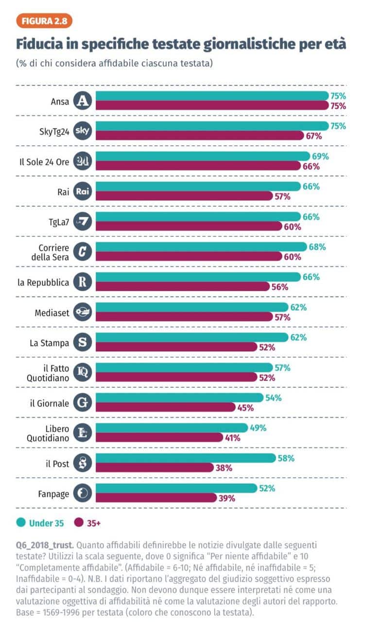 Partiamo da un dato: solo un italiano su tre si fida delle notizie. Un risultato in linea con quello degli altri Paesi. “Le testate che godono di maggior fiducia da parte degli italiani sono quelle meno schierate e capaci di parlare a un pubblico ampio e diversificato”, sottolinea Alessio Cornia. Al primo posto nella classifica delle testate italiane c’è l’agenzia Ansa, al secondo posto Sky tg24 e al terzo Il Sole 24 ore. Una graduatoria che conferma il podio rispetto allo scorso anno. Nel report italiano viene approfondito questo dato aggiungendo anche il riferimento all’età degli intervistati: la fiducia sale dal 69% al 75% per la nostra testata. La domanda sul grado di affidabile è stata posta anche per le piattaforme social che abbiamo visto essere tra le principali fonti di informazione. Sono tanto consultate ma non per questo vengono considerate con un alto valore informativo. “Tra le piattaforme analizzate, TikTok risulta la più problematica - si legge nel report - . Ben il 27% degli utenti riporta difficoltà nel distinguere le notizie attendibili da quelle false su questa piattaforma. Seguono X/Twitter) (21%), Facebook (21%) e Instagram (18%). Al contrario, WhatsApp e Google Search si posizionano ai vertici della classifica per la facilità con cui è possibile valutare l’affidabilità dell’informazione. Questo è probabilmente dovuto al fatto che, su WhatsApp, le notizie provengono principalmente da contatti stretti, creando un flusso di informazioni più personale e ritenuto più affidabile dagli utenti”.