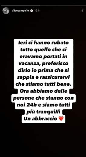 “Ieri ci hanno rubato tutto quello che ci eravamo portati in vacanza. Preferisco dirlo io prima che si sappia e rassicurarvi che stiamo tutti bene. Ora abbiamo delle persone che stanno con noi 24h e siamo tutti più tranquilli. Un abbraccio”. Con queste parole Alice Campello, imprenditrice e moglie del calciatore della Spagna Alvaro Morata, ha rivelato in una storia apparsa su Instagram di esser stata vittima di un furto. Nessun dettaglio su dove sia successo il fatto, mentre è certo che il centravanti spagnolo ha vissuto da lontano l’evento, essendo impegnato negli Europei di Germania, proprio in attesa di sfidare i padroni di casa nei quarti di finale.