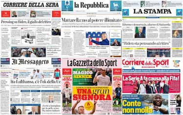 Sulle prime pagine di oggi il giallo sul possibile ritiro di Joe Biden dalla corsa alla Casa Bianca, che però smentisce. Poi il discorso di Mattarella che avverte: "Pericolosa un’autorità senza opposizione". Spazio anche allo sport con la sfida a Wimbledon tra gli azzurri Sinner e Berrettini: vittoria dell'altoatesino che vola al terzo turno