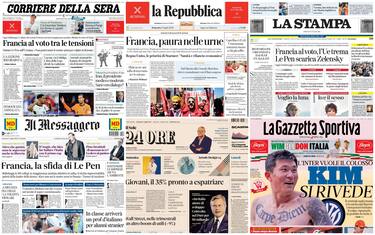 Le aperture dei giornali sono tutte concentrate sul ballottaggio in Francia, con il Rn che "vede" la vittoria e Le Pen che "scarica" Zelensky. Poi si torna a parlare di nomine Ue, con la trattativa tra von der Leyen e Meloni. Infine la morte del cantautore Pino D'Angiò e le semifinaliste degli Europei di calcio
