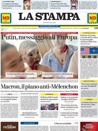 - Anche LaStampa si concentra sulla guerra in Ucraina, titolando 'Putin, messaggio all'Europa', accompagnato dalla drammatica fotografia deiferiti dell'ultimo attacco. Subito sotto, il piano anti-Melenchon di Macron, col presidente che conferma a tempo Attal e punta a unacoalizione senza l'estrema sinistra