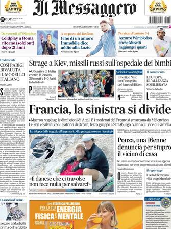 - Il Messaggero punta sulle manovre post voto in Francia, sottolineando le divisioni all'interno della sinistra. Taglio alto per la strage a Kiev, con i missili russi sull'ospedale dei bambini. C'è spazio anche per la cronaca, con la denuncia per stupro del vicino di casa da parte di una 16enne a Ponza