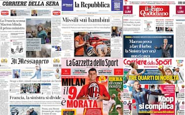 - Il Corriere della Sera divide a metà la sua prima pagina: da un lato la difficile trattativa sul governo transalpino condotta dal presidente Emmanuel Macron, dall'altro l'orrore a Kiev, con i missili russi sull'ospedale dei bambini