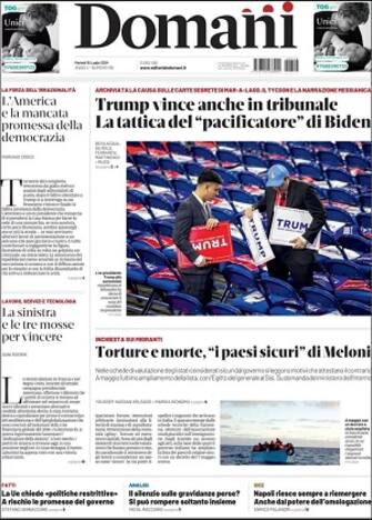 - Aperura sempre sugli Usa, ma con un taglio giudiziario, con l'archiviazione per il tycoon del caso sulle carte segrete: "Trump vince anche in tribunale. La tattica del pacificatore di Biden". Correlato un approfondimento in spalla di Mariano Croce. "L'America e la mancata promessa di democrazia" In taglio medio, il tema migranti: "Torture e morte, 'i Paesi sicuri' di Meloni"