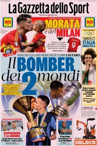 - Titolo principale sull'attaccante dell'Inter Lautaro, vincitore con l'Argentina della Coppa America: "Il bomber dei due mondi". In taglio altro, l'arrivo nelle file dei rossoneri del campitano della Spagna campione d'Europa: "Morata è del Milan". In taglio basso, due notizie di calciomercato: le trattative per far arrivare Koopminers alla Juventus e quelle per Osimhen del Psg