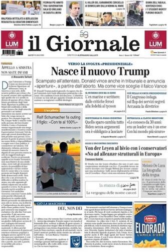 - Titolo principale sulla convention Gop: "Trump passa già al contrattacco". In spalla, la guerra in Ucraina: "Zelensky: 'Sì alla Russia al prossimo summit per la pace". Poi la sentenza sul terremoto a L'Aquila del 2009: "Sisma, verdetto choc sugli studenti morti: 'Sono stati incauti'". Segue il caso di Ventimiglia: "Scopre le migranti nascoste nel Tir e le prende a frustate". Fotonotizia sul premio 'European mathematical society" vinto da Cristiana De Filippis: "La matematica e l'intuizione mentre lavavo un piatto"