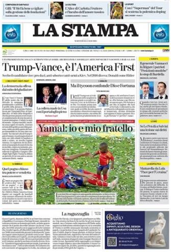 - Anche in questo caso, il titolo principale è sugli Usa: "Trump-Vance, è l'America first". In spalla, la spaccatura tra Lega e Rn sulla nomina nel nuovo gruppo sovranista europeo: "Il generale Vannacci fa litigare i patrioti. 'Posizioni omofobe', lo stop di Bardella". Segue un approfondimento sul tema: "Se Le Pen dà a Salvini una lezione sui diritti". Sempre in spalla, la visita del presidente della Repubblica in Brasile: "Mattarella da Lula: 'Pace per l'Ucraina'". Fotonotizia dedicata al nuovo fuoriclasse della Spagna: "Yamal: io e mio fratello"