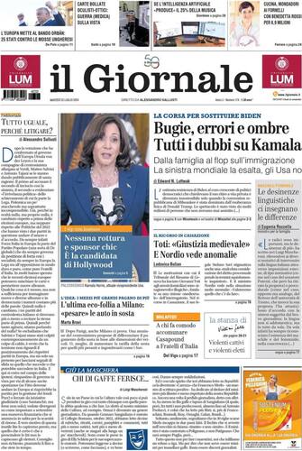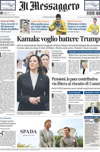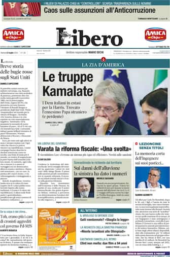 - Harris al centro dell’apertura del quotidiano che punta a far emergere tutti gli aspetti negativi della vicepresidente statunitense: “Bugie, errori e ombre. Tutti i dubbi su Kamala”. Ricorso in Cassazione sul caso Liguria che vede coinvolto il presidente della Regione Giovanni Toti che parla di “giustizia medievale". Il commento della ministra per la famiglia Roccella in merito alla proposta della Lega, poi ritirata, di vietare le desinenze femminili nelle professioni: “Le desinenze linguistiche ci insegnano le differenze”