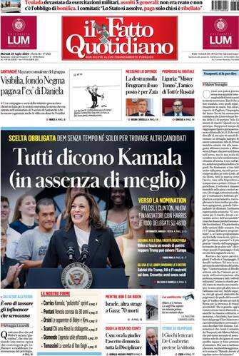- Caso Visibilia: “il fondo Negma pagava l’ex di Daniela Santanché”. Come scrive il quotidiano, l’ex compagno e socio della ministra “procacciava clienti in Italia per la società emiratina”. “Trasporti, si fa per dire” è il titolo dell’editoriale del direttore Marco Travaglio, dedicato al caos nei trasporti: ogni giorno ci sono ritardi, “ormai a fare scandalo è la puntualità”. In Usa quella dei dem è una “scelta obbligata" dopo il ritiro di Biden: “Tutti dicono Kamala (in assenza di meglio)”