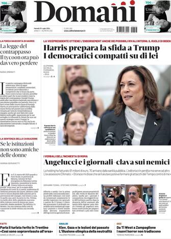 - “Harris prepara la sfida a Trump. I democratici compatti su di lei”: la vicepresidente ottiene l’endorsement anche dei possibili rivali interni. Ora per Donald Trump la sfida si apre di nuovo e il “tycoon potrebbe davvero perdere”. Spazio all’inchiesta di Roma sul caso Angelucci: tra editoria e sanità, con la prima perde soldi, con la seconda fattura milioni. Poi l’intervista al turista ferito dall’orso in Trentino. Sul fronte estero, un’analisi di Valerio Piccioni sulle guerre: “Kiev, Gaza e le lezioni del passato. L’illusione olimpica della neutralità”