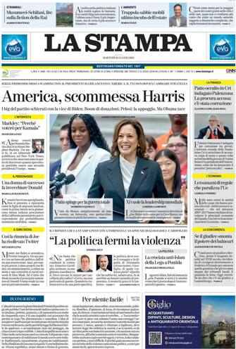 - “America, scommessa Harris”: dopo l’endorsement di Biden tutti i big dem si schierano dalla parte della vicepresidente statunitense. Per Kamala Harris molti i temi caldi da affrontare in questa brevissima campagna elettorale che la aspetta: da Putin, apertamente contrario alla sua candidatura, a Xi che non commenta quanto accaduto negli Usa ma pensa già a come gestirne le conseguenze. Il giornalista della Stampa pestato a Torino: l'articolo scritto dallo stesso protagonista della vicenda, Andrea Joly: “La politica fermi la violenza”