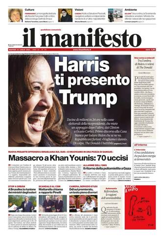 - “Harris ti presento Trump” è il titolo originale con cui il quotidiano apre la sua prima pagina. I repubblicani furiosi dopo il ritiro di Biden e l’ingresso in corsa di Kamala: “Vogliamo i danni”. Uno sguardo alla guerra a Gaza dopo il massacro di Khan Yunis che ha provocato 70 morti. In Europa stop a Orban: la riunione dei ministri degli Esteri del 28-29 agosto non si terrà più a Budapest ma a Bruxelles. A pesare sulla scelta sono le missioni diplomatiche e i rapporti tra Orban e Putin