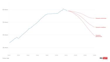 Il calo, tuttavia, potrebbe anche risultare meno sostenuto. Se si verificassero alcune condizioni, la perdita complessiva potrebbe infatti arrestarsi a 5,9 milioni di individui. Sempre tanti in assoluto ma meno della metà rispetto allo scenario giudicato più probabile. Bene, dunque, ma solo fino a un certo punto. Perché per un'ipotesi “migliore” ce n'è anche una “peggiore”. Quella che vede gli abitanti dello Stivale scendere a 39,6 milioni nel 2080, più o meno quanti erano nel 1927, con una decrescita di 19,7 milioni rispetto ad oggi.