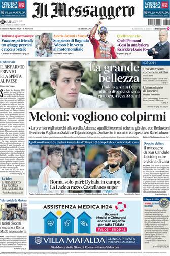 Aperture quasi interamente dedicate alle parole di Giorgia Meloni, all'attacco dopo le voci di indagini sulla sorella Arianna. La premier parla di "metodo già adottato con Berlusconi" per colpire il governo. Grande evidenza per la scomparsa a 88 anni di un'icona del cinema come Alain Delon, mentre la prima domenica di Serie A è contrassegnata dallo sfogo di Antonio Conte dopo il pesante ko del Napoli a Verona e dall'attesa per il debutto della Juventus di Thiago Motta