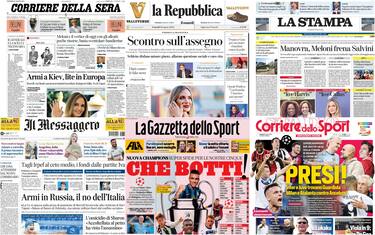 - Aperture in ordine sparso sui principali quotidiani italiani. Il Corriere della Sera sceglie di puntare sul conflitto in Ucraina e, in particolare, sullo scontro delle ultime ore nato attorno alle armi a Kiev e ai limiti al loro utilizzo. Taglio alto per l'anteprima del vertice odierno tra Giorgia Meloni e gli alleati di governo. Fotonotizia centrale, invece, per la super ospite della Mostra del cinema di Venezia, Angelina Jolie