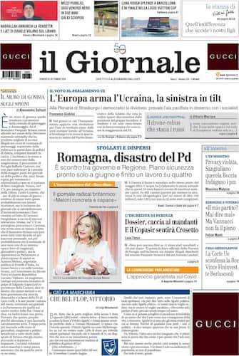 - L'apertura del Giornale è dedicata al voto al Parlamento europeo di ieri: "L'Europa arma l'Ucraina, la sinistra in tilt". "Alla Plenaria di Strasburgo i democratici si dividono: prevale l'ala pacifista in dissenso con i socialisti". Sul maltempo che ha piegato la Romagna: "Romagna, disastro Pd" è il titolo del pezzo che racconta lo scontro tra governo e Regione