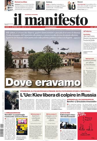 - "Dove eravamo", è il titolo a tutta pagina del Manifesto che racconta la seconda alluvione in Romagna a dopo più di un anno dalla prima. "Cambiare priorità per abitare la crisi climatica" è l'editoriale a firma di Paolo Missiroli. Sul via libera di Strasburgo alle armi in Ucraina: "L'Ue: Kiev libera di colpire in Russia"