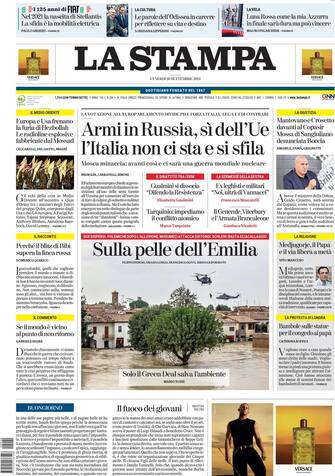 - "Armi in Russia, sì dell'Ue. L'Italia non ci sta e si sfila" titola questa mattina La Stampa raccontando la votazione all'Europarlamento che ha diviso Pd e Forza Italia. "Sulla pelle dell'Emilia" è il reportage che racconta le conseguenze del maltempo in Emilia Romagna, dove ci sono ancora due dispersi.