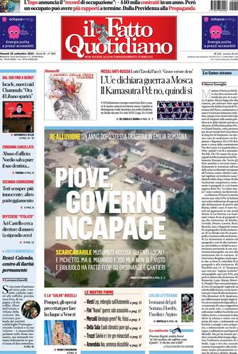 - "Piove, governo incapace" è il titolo provocatorio del Fatto Quotidiano che racconta l'esondazione dei fiumi che ha messo di nuovo in ginocchio la Romagna, chiamandola "ri-alluvione". "Scaricabarile" tra governo e Regioni. Sul fronte Ucraina: "L'Ue dichiara guerra a Mosca. Il Kamasutra Pd: no, quindi sì". "Lo famo strano" è l'editoriale politico del direttore Marco Travaglio