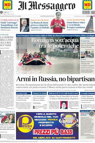 - "Romagna sott'acqua tra le polemiche" è il titolo del Messaggero sul maltempo: "Torna l'emergenza. Fiumi esondati, migliaia di sfollati, due dispersi". Sul fronte Ucraina e il via libera di Strasburgo alla risoluzione sul sostegno a Kiev: "Armi in Russia, no bipartisan"