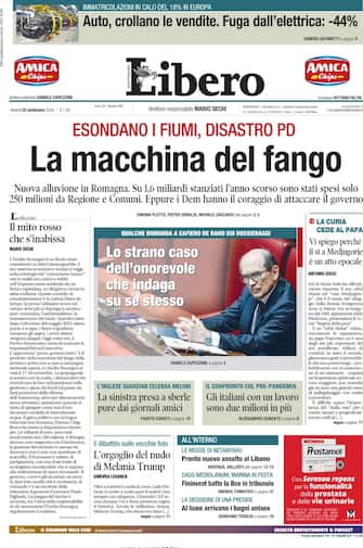 - "La macchina del fango" è il titolo di apertura scelto da Libero per raccontare il maltempo che ha di nuovo messo in ginocchio la Romagna e lo scontro politico che ne è seguito: "Esondano i fiumi, disastro Pd". "Su 1,6 miliardi stanziati l'anno scorso sono stati spesi solo 250 milioni da Regione e Comuni". Taglio centrale dedicato al caso dossier sull'ex procuratore Federico Cafiero De Raho